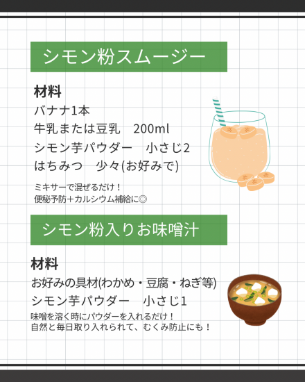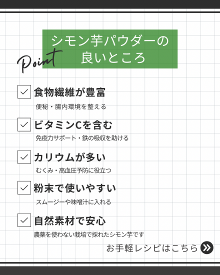 シモン芋パウダー100gは、その豊富な栄養素を手軽に摂取できるので、忙しい現代人にもおすすめです。